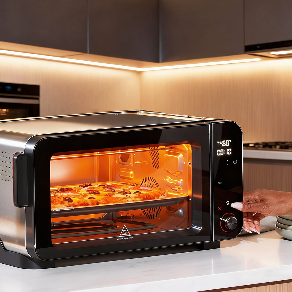 Compact & Spacious – Fits a 12” pizza, 6 slices of toast, or a whole 4 lb chicken.